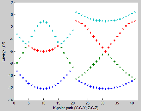 Here you can see that the band structure does not look like a cosine function along directions Y-Gamma and Z-Gamma. The band structure is folded according to the multiplicity along those directions used when constructing the supercell (Fig. 1b).