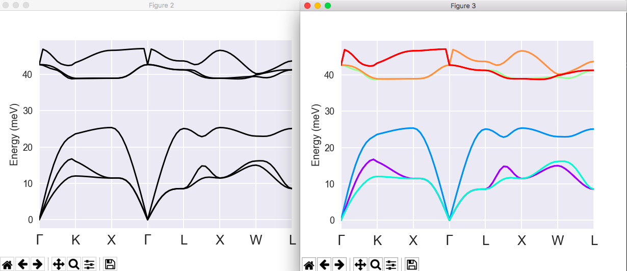 - (left) Phonon bands without LO-TO splitting (right) Plot with band connection estimated from the overlap of the eigenvectors at adjacent q-points