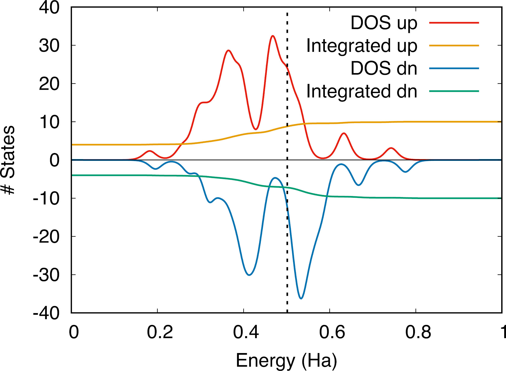 We observe that the up and down DOS channels have been “shifted” with respect to each other, which is a footprint of the presence of non-zero total magnetization in the crystal (either ferro- or ferri-magnetic). The integrated DOS yields the number of electrons for each spin direction, and we see that the magnetization arises from the fact that there are more up than down electrons at the Fermi level.